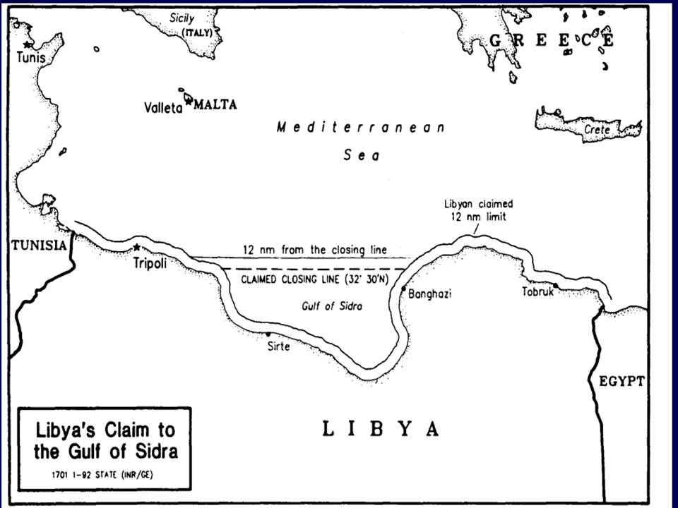 ΣΗΜ: 1) Η Λιβύη ισχυρίζεται ότι ο κόλπος της Σύρτης είναι ιστορικός κόλπος (προβλέπεται από την UNCLOS ιστορικούς κόλπους κι έτσι αποδεχθήκαμε και το κλείσιμο του κόλπου του Τάραντα από την Ιταλία στην μεταξύ μας οριοθέτηση). Όμως και στο παρελθόν είχε συμβεί σύγκρουση μεταξύ Λιβύης και Καντάφι με τις ΗΠΑ για την καταχρηστική αυτή πράξη από την Λιβύη.