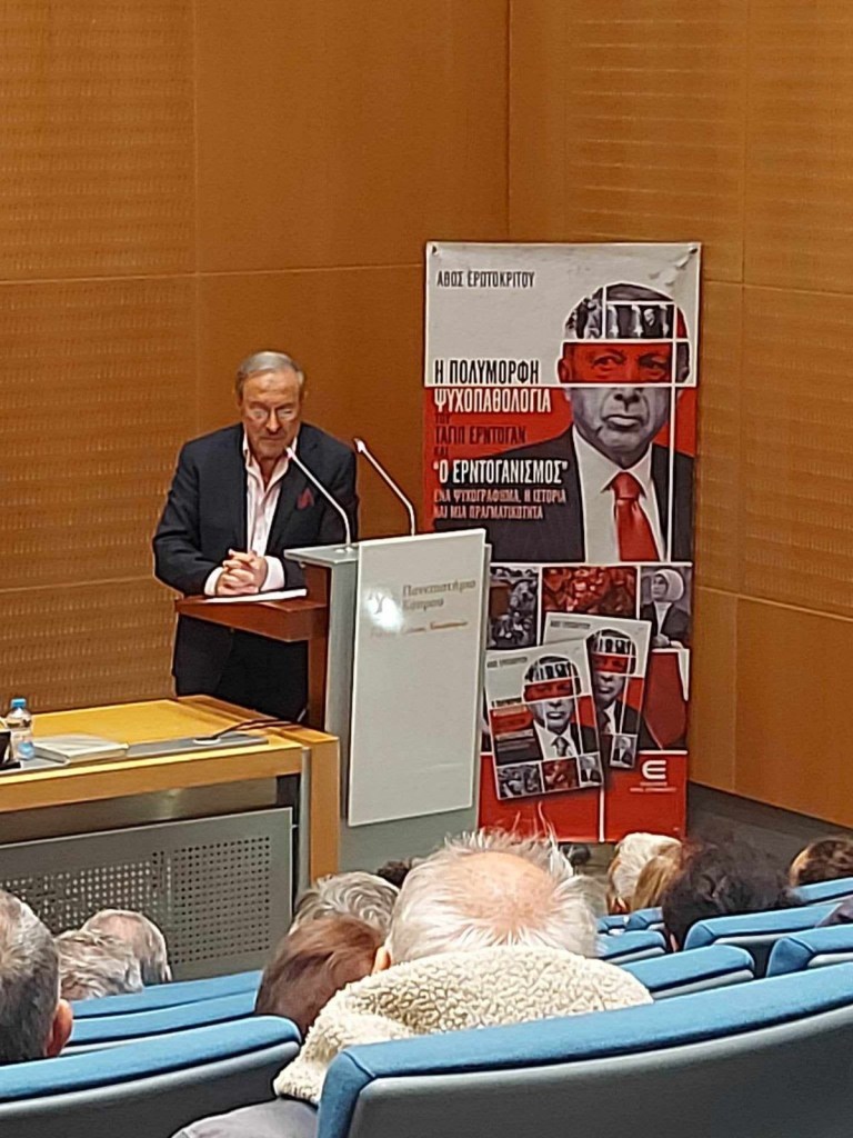 Από την παρουσίαση του Βιβλίου του Άθω Ερωτοκρίτου «Η πολύμορφη ψυχοπαθολογία του Ερντογκάν στον Φ.Σ. Παρνασσός στην Αθήνα 2023.
