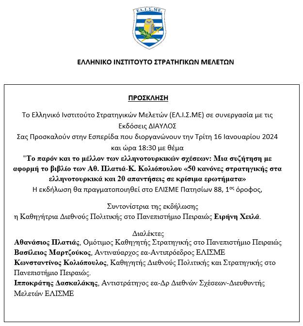 Το Ελληνικό Ινστιτούτο Στρατηγικών Μελετών – ΕΛΙΣΜΕ σε συνεργασία με τις εκδόσεις ΔΙΑΥΛΟΣ διοργανώνει μια ενδιαφέρουσα εσπερίδα με θέμα: «Το παρόν και το μέλλον των ελληνοτουρκικών σχέσεων: Μια συζήτηση με αφορμή το βιβλίο των Αθ. Πλατιά-Κ. Κολιόπουλου «50 κανόνες στρατηγικής στα ελληνοτουρκικά και 20 απαντήσεις σε κρίσιμα ερωτήματα».