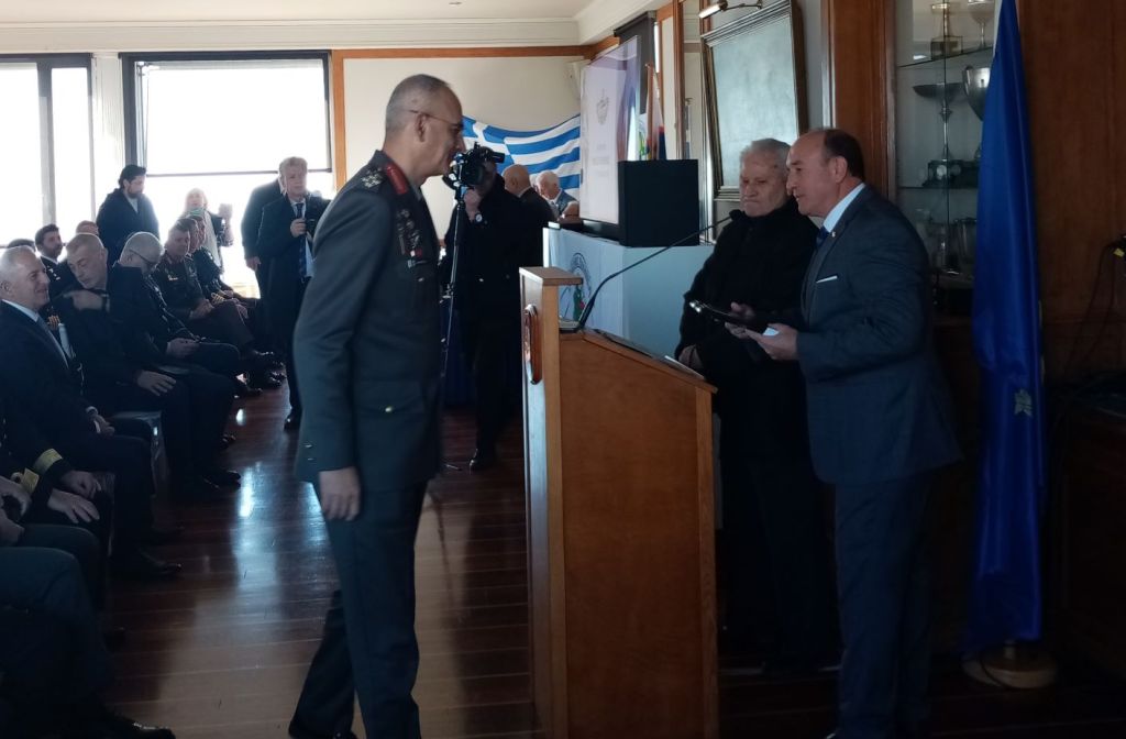 φωτ. Από αριστερά, ο νέος Αρχηγός ΓΕΕΘΑ Στρατηγός Δημήτριος Χούπης παραλαμβάνει τιμητική πλακέτα από τον Πρόεδρο του Συνδέσμου Ελλήνων Βατραχανθρώπων, Αρχιπλοίαρχο ε.α. Αλέξανδρο Παλατιανό για να την επιδώσει σε Τιμώμενο Βετεράνο ΟΥΚ