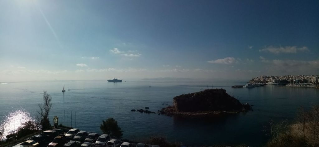 φωτ.Η θέα από το μπαλκόνι του Ναυτικού Ομίλου Ελλάδος, μπροστά η Νήσος Κουμουνδούρου και στο βάθος ανοιχτά της Μαρίνας Ζέας το αμερικανικό ελικοπτεροφόρο αποβατικό πλοίο USS BATAAN LHD-5
