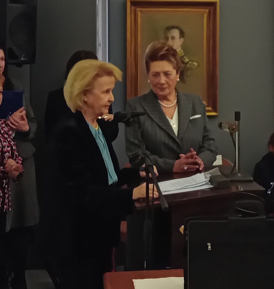 Μετά το πέρας της ομιλίας της Προέδρου, ακολούθησε η απονομή τιμητικών βραβεύσεων στην κα Άννα Ψαρούδα – Μπενάκη π. Πρόεδρο της Βουλής και Ακαδημαϊκό και την κα Ελένη Κορωνάκη, Διευθύνουσα Σύμβουλο της εταιρίας Δ.Κορωνάκης ΑΒΕΕ.