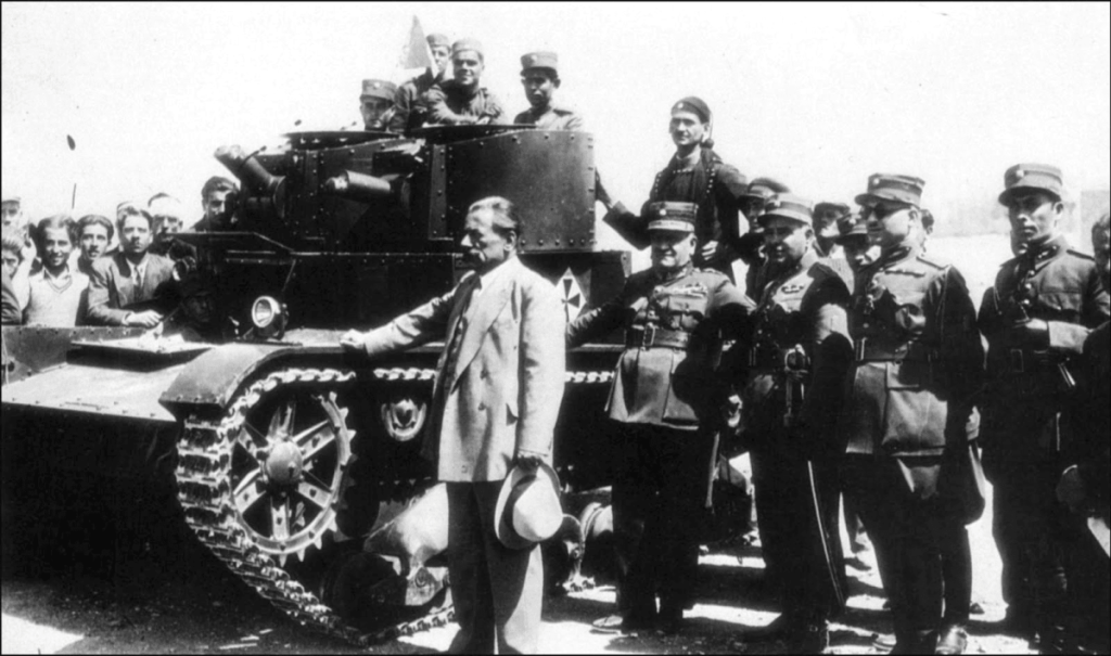 Ο Υπουργός Στρατιωτικών Γεώργιος Κονδύλης και ο Στρατηγός Αχιλλέας Πρωτοσύγγελος επιθεωρούν τανκ Vickers 6-ton Type A (πηγή: Ιστορία του Ελληνικού Έθνους)