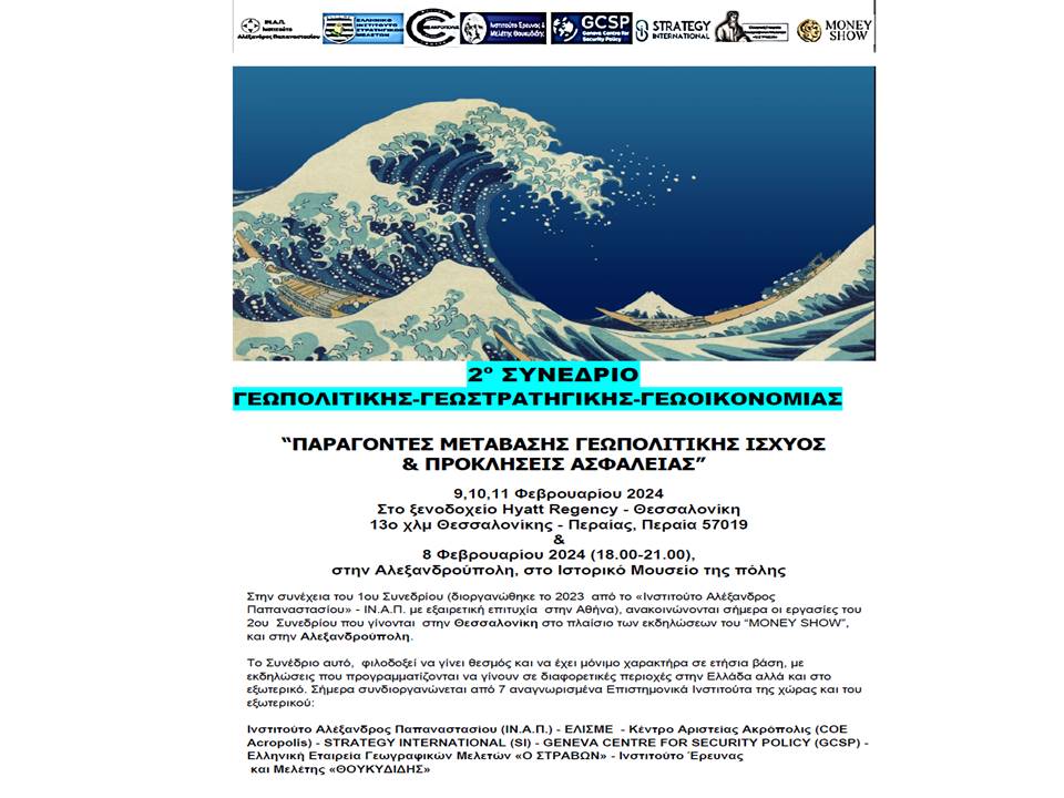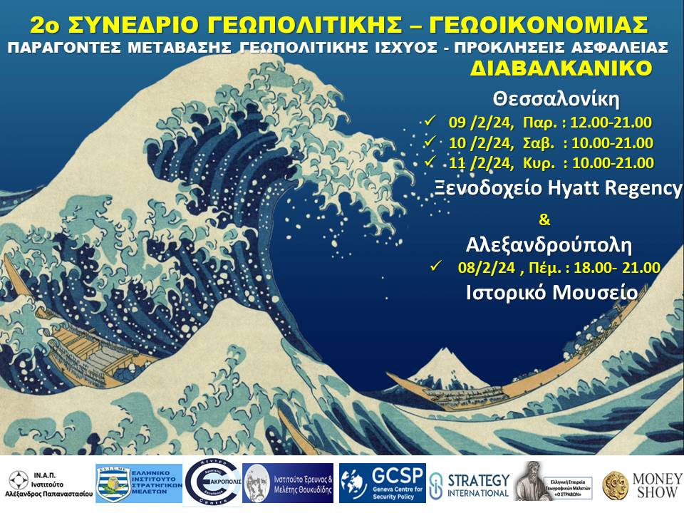 Στη συνέχεια του 1ου Συνεδρίου Γεωπολιτικής που διοργανώθηκε το 2023 με εξαιρετική επιτυχία στην Αθήνα από το Ινστιτούτο «Αλέξανδρος Παπαναστασίου»-(ΙΝ.Α.Π)» -πατήστε εδώ, ανακοινώνονται οι εργασίες του 2ου Συνεδρίου που θα διεξαχθούν: