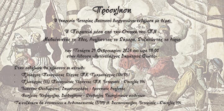 Εκδήλωση με θέμα: «Η πειρατεία μέσα από την οπτική του ΠΝ – Μαθαίνοντας το χθες, αναλύοντας το σήμερα, συζητώντας το αύριο» θα λάβει χώρα στην Υπηρεσία Ιστορίας Ναυτικού (Αίθουσα Αντιναυάρχου Φωκά) την Τετάρτη 21 Φεβρουαρίου και ώρα 18:00.