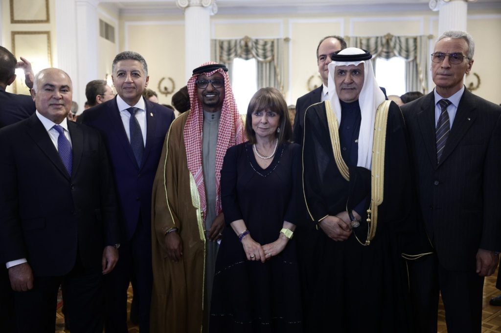 από αριστερά, ο Πρέσβης του Ιράκ κ. Mouayed Saleh, δίπλα του ο Πρέσβης της Αιγύπτου κ. Omar Amer Youssef, αμέσως μετά ο Πρέσβης του Κουβέιτ κ. Mansour Saad Al Olaimi, στο κέντρο η Πρόεδρος της Δημοκρατίας κα Κατερίνα Σακελλαροπούλου, στα αριστερά της ο Πρέσβης της Σαουδικής Αραβίας κ. Saad Alammar και στο βάθος διακρίνεται ο Πρέσβης της Παλαιστίνης κ. Yussef Victor Dorkhom – φωτ.Προεδρία της Δημοκρατίας