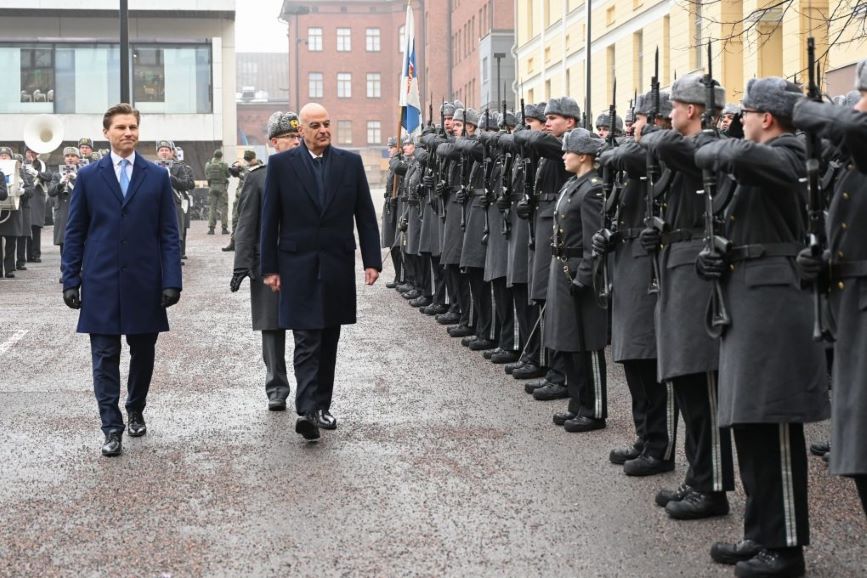 Συνάντησα τον ομόλογό μου προ ολίγου, τον κύριο Άντι Χακάνεν. Είχαμε μία βαθιά και ενδιαφέρουσα συζήτηση, κατ’ αρχάς για τα θέματα που δημιουργούνται από την ρωσική εισβολή στην Ουκρανία και τη συμπλήρωση των δύο χρόνων από αυτήν, για την πορεία της Ευρώπης, για την δημιουργία ενός αμυντικού βραχίονα της Ευρωπαϊκής Ένωσης. Τον ενημέρωσα για την κατάσταση στην ανατολική Μεσόγειο, στην βόρεια και στην υποσαχάρια Αφρική και είχαμε την ευκαιρία επίσης να συζητήσουμε για έναν από τους κύριους λόγους της επίσκεψής μου, την «Ατζέντα 2030» για τις Ελληνικές Ένοπλες Δυνάμεις και την πρόθεσή μας να αντιγράψουμε το φινλανδικό μοντέλο εφεδρείας.