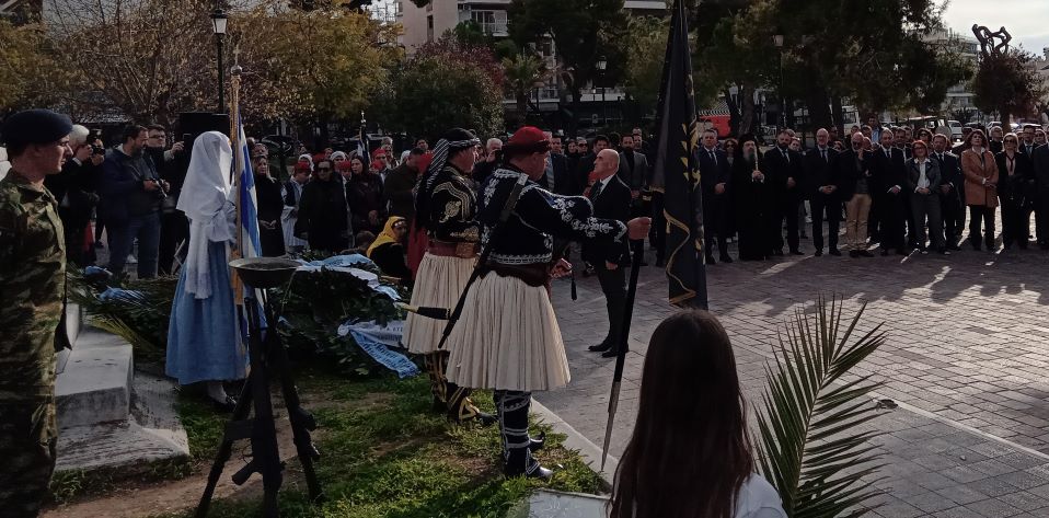 Ακολούθως, πραγματοποιήθηκε Επιμνημόσυνη Δέηση, τηρήθηκε ενός λεπτού σιγή, ακούστηκε ο Εθνικός Ύμνος από την μπάντα του Δήμου Πατρέων και παρουσία στρατιωτικού αγήματος και εν συνεχεία, έγινε η κατάθεση στεφάνων από φορείς και συλλογικότητες.