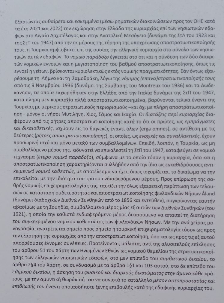 Για αυτό εγώ θα έλεγα στο επίπεδο του εθιμικού διεθνούς δικαίου μπορούμε να ασκήσουμε το φυσικό και διαρκές δικαίωμά μας στην άμυνα δηλαδή στην προάσπιση της εδαφικής μας κυριαρχίας διατάσσοντας ή αναδιατάσσοντας τις ένοπλες δυνάμεις μας σε κάθε σπιθαμή της ελληνικής επικράτειας και αυτή είναι η καινοτομία του έργου μου.