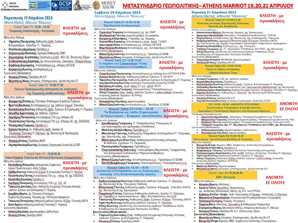Το Ινστιτούτο Αλέξανδρος Παπαναστασίου -IN.A.Π., το Ελληνικό Ινστιτούτο Στρατηγικών Μελετών – ΕΛΙΣΜΕ, το Geneva Centre for Security Policy -GCSP, και η Ελληνική Εταιρεία Γεωγραφικών Μελετών “Ο ΣΤΡΑΒΩΝ”, συνδιοργανώνουν το προσεχές τριήμερο 19-21 Απριλίου 2024 στο πλαίσιο του “Money Show” στην Αθήνα ένα ενδιαφέρον και επίκαιρο συνέδριο με θέμα τις στρατηγικές επιλογές για ανάσχεση του Τουρκικού Επεκτατισμού.