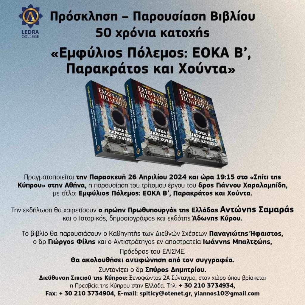 Η παρουσίαση του τρίτομου βιβλίου του διακεκριμένου διεθνολόγου – δημοσιογράφου Δρος Γιάννου Χαραλαμπίδη με τίτλο: “ΕΜΦΥΛΙΟΣ ΠΟΛΕΜΟΣ: ΕΟΚΑ Β’, ΠΑΡΑΚΡΑΤΟΣ ΚΑΙ ΧΟΥΝΤΑ” που κυκλοφορεί από τις εκδόσεις του κολλεγίου Ledra της Λευκωσίας θα πραγματοποιηθεί αύριο Παρασκευή 26 Απριλίου 2024 στο Σπίτι της Κύπρου στο Σύνταγμα, Ξενοφώντος 2Α (ώρα 19:15).