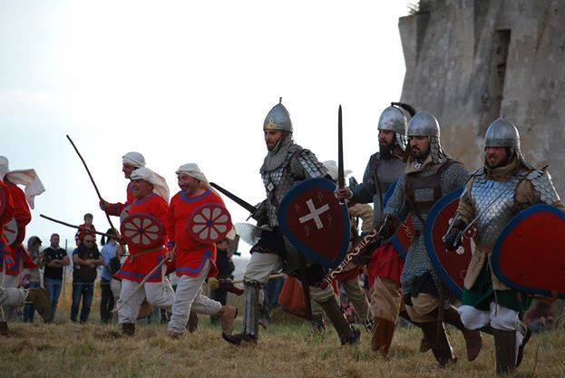 Βυζαντινοι εθνοφύλακες στα δεξια τακτικών στρατιωτών απο τον συλλογο Cavalieri de al Terre Tarantini