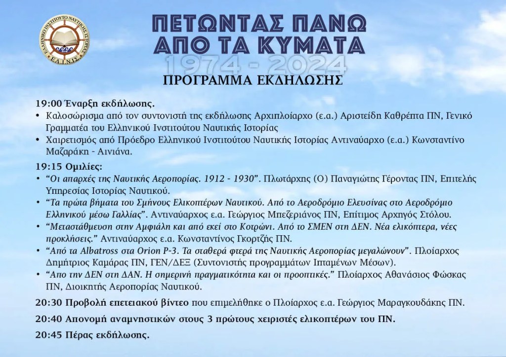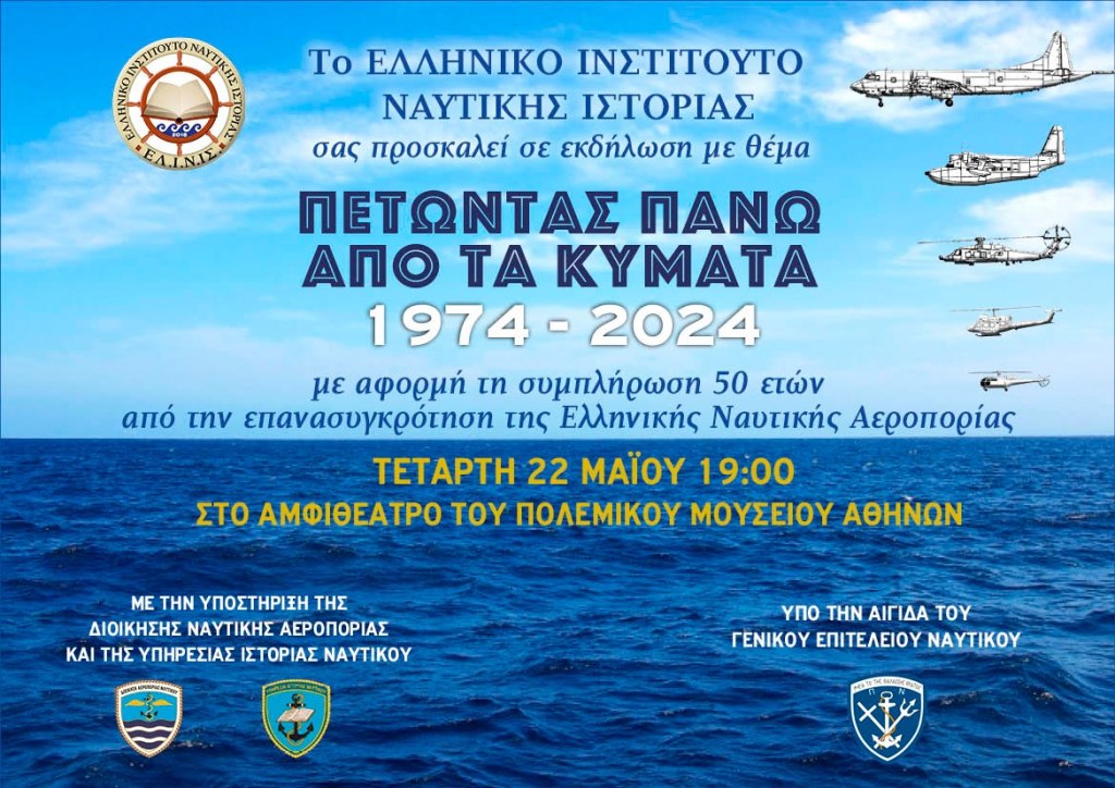 Εκδήλωση με αφορμή τη συμπλήρωση 50 ετών από την επανασυγκρότηση της Ελληνικής Ναυτικής Αεροπορίας θα λάβει χώρα την Τετάρτη 22 Μαΐου 2024 ώρα 19:00 στο Αμφιθέατρο του Πολεμικού Μουσείου Αθηνών προκειμένου να τιμηθεί η ιστορία και η σημαντική μέχρι σήμερα προσφορά του αεροπορικού βραχίονα του Πολεμικού Ναυτικού.