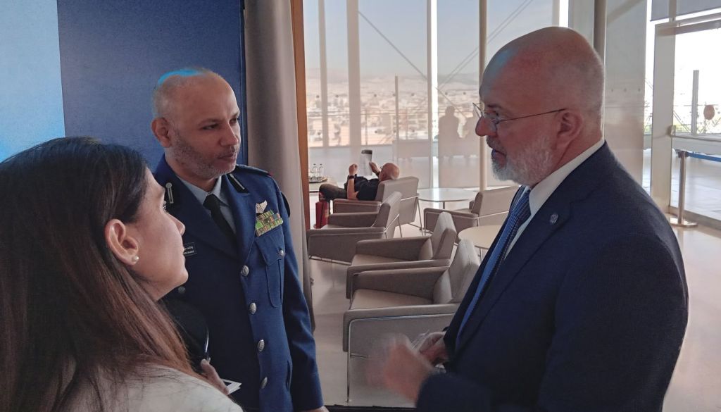 φωτ. ο κ. Αναστάσιος Ροζολής από δεξιά συνομιλεί με την κα Ελίνα Βλάχου, Defence Advisor της Σαουδικής Αραβίας και τον Στρατιωτικό Ακόλουθο της Σαουδικής Αραβίας Σμήναρχο κ. Rashed Alaboudi
