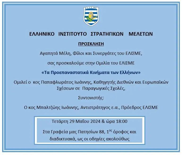 Ομιλία με θέμα «Τα Προεπαναστατικά Κινήματα των Ελλήνων» θα πραγματοποιηθεί σήμερα Τετάρτη 29 Μαϊου 2024, στις 18:00μμ από το Ελληνικό Ινστιτούτο Στρατηγικών Μελετών (ΕΛΙΣΜΕ) με ομιλητή τον Δρα Ιωάννη Παπαφλωράτο και συντονιστή τον Αντιστράτηγο ε.α. κ. Ιωάννη Μπαλτζώη Πρόεδρο του ΕΛΙΣΜΕ.