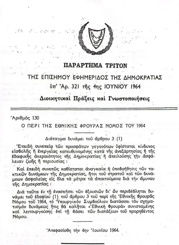 Γιορτάζουμε σήμερα τη συμπλήρωση των 60 Χρόνων από την ημέρα ιδρύσεως της Εθνικής Φρουράς (ΕΦ) στις 04 Ιουνίου 1964, όταν το Υπουργικό Συμβούλιο με Διάταγμα αποφασίζει την συγκρότηση της στρατιωτικής δύναμης με την επωνυμία «Εθνική Φρουρά» δυνάμει του Άρθρου 3 του «Περί της Εθνικής Φρουράς Νόμου του 1964», ο οποίος ψηφίστηκε από την Βουλή των Αντιπροσώπων 3 ημέρες νωρίτερα.