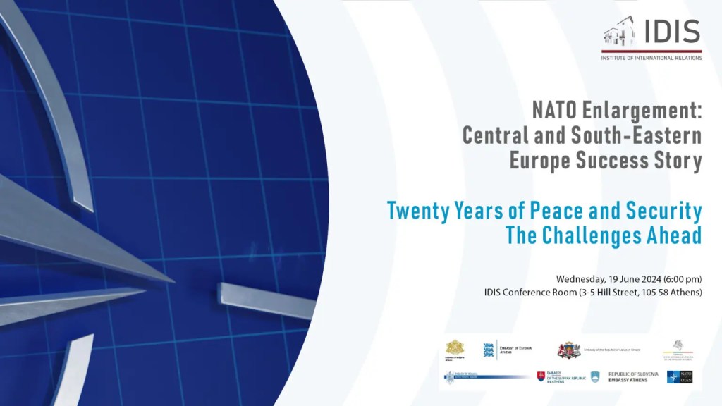 Εκδήλωση με θέμα: “Διεύρυνση του ΝΑΤΟ: Ιστορία Επιτυχίας της Κεντρικής και Νοτιοανατολικής Ευρώπης /Είκοσι Χρόνια Ειρήνης και Ασφάλειας – Οι Προκλήσεις Μπροστά” διοργανώνει το Ινστιτούτο Διεθνών Σχέσεων (ΙΔΙΣ) του Παντείου Πανεπιστημίου την Τετάρτη, 19 Ιουνίου 2024 (6:00 μμ), στην Αίθουσα Συνεδριάσεων του Ινστιτούτου, Χίλλ 3-5, Αθήνα.