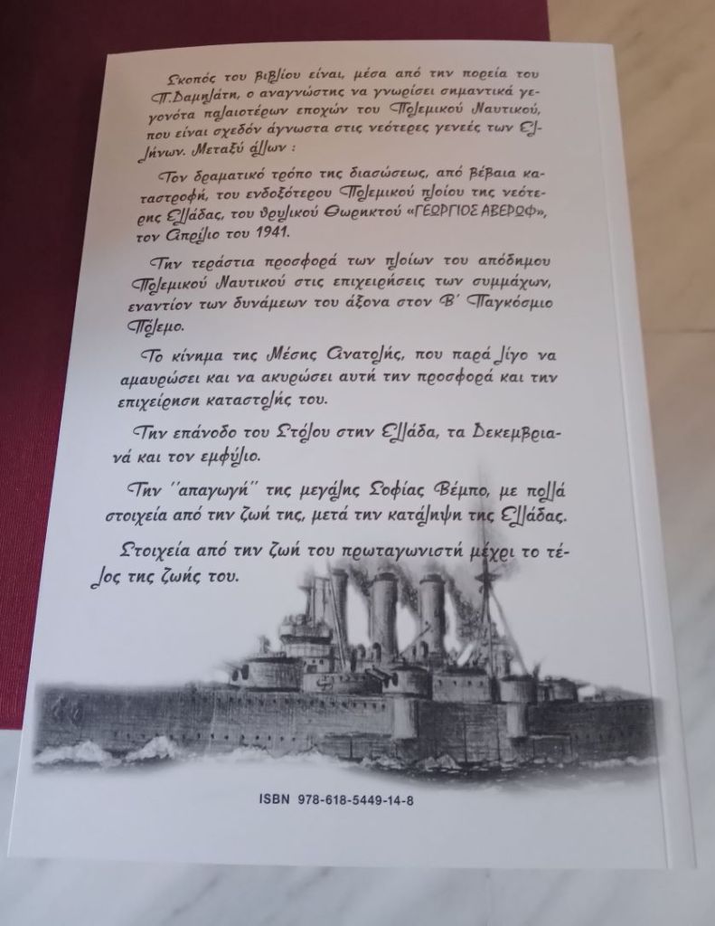 Το βιβλίο του Υποναυάρχου ε.α. Π.Ν. Ιωάννη-Νικολάου Δαμηλάτη «Η Σωτηρία του Θ/Κ Γεώργιος Αβέρωφ και η πορεία ενός σεμνού ήρωα – Πότης Δαμηλάτης» εξώφυλλο και οπισθόφυλλο