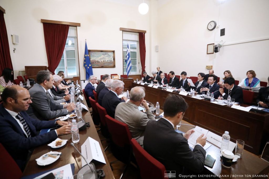 Στη συνάντηση που ακολούθησε, παρουσία των βουλευτών Άγγελου Συρίγου, Ευάγγελου Αποστολάκη και Δημητρίου Μάντζου, ο προεδρεύων, Αντιπρόεδρος της Επιτροπής Εθνικής Άμυνας και Εξωτερικών Υποθέσεων, κ. Δημήτριος Καιρίδης, εξέφρασε την άποψη περί αξιοποίησης των δυνατοτήτων των δύο χωρών ως πυλώνων σταθερότητας και περιφερειακής ασφάλειας, στη βάση σεβασμού του Διεθνούς Δικαίου της Θαλάσσης και αποδοχής των προβλέψεων της σχετικής Σύμβασης των Ηνωμένων Εθνών (UNCLOS). Εν συνεχεία, ο κ. Ευάγγελος Αποστολάκης επιβεβαίωσε την ανάγκη για προστασία του καθεστώτος ανοικτής θαλάσσης και ελεύθερης ναυσιπλοΐας και υπέμνησε ότι η αγαστή συνεργασία των δύο χωρών στο πλαίσιο της θεσμικής συνεργασίας εντός των Διεθνών Οργανισμών, δημιουργεί τις κατάλληλες συνθήκες για την περαιτέρω εμπέδωση της διμερούς συνεργασίας και σε άλλους τομείς με αμοιβαία ωφέλεια. Ο κ. Συρίγος σημείωσε ότι η ελληνική πλευρά παρακολουθεί με ενδιαφέρον τις ιαπωνικές κινήσεις στην εξωτερική πολιτική, αναλογιζόμενη τα αντίστοιχα προβλήματα που αντιμετωπίζει η Ελλάδα στην ανατολική Μεσόγειο.