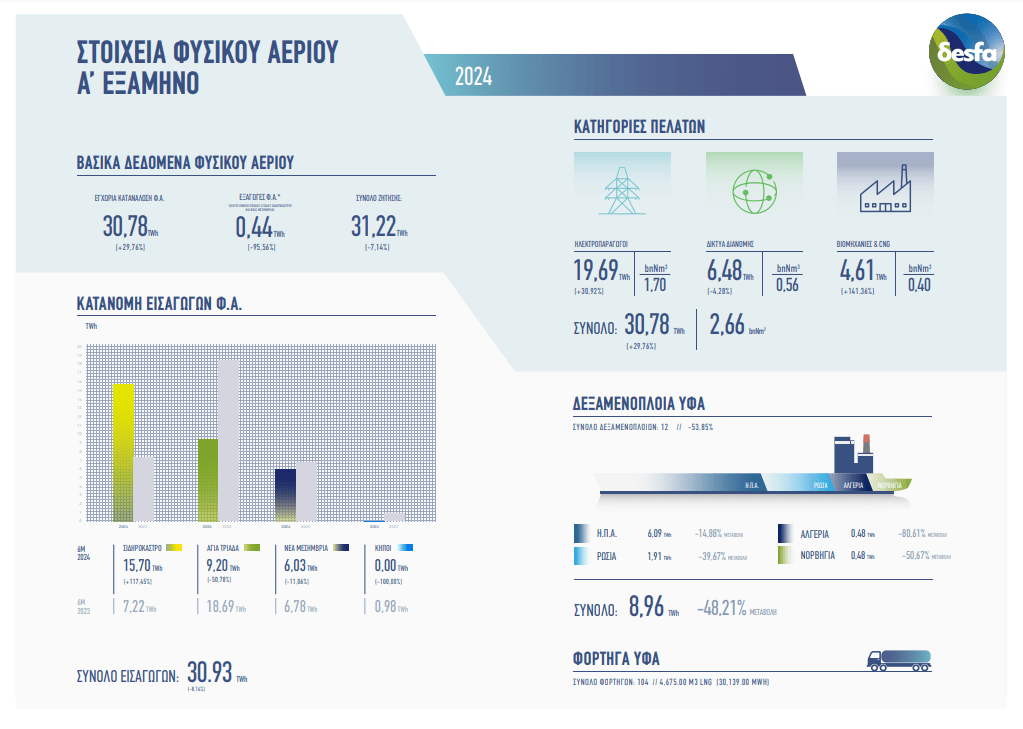 Σύμφωνα με τα στοιχεία του ΔΕΣΦΑ, κατά το πρώτο εξάμηνο του 2024, η εγχώρια κατανάλωση φυσικού αερίου αυξήθηκε κατά 29,76%, αγγίζοντας τις 30,78 Τεραβατώρες (TWh), από 23,72 TWh στην αντίστοιχη περσινή περίοδο. Αντίθετα, η συνολική ζήτηση φυσικού αερίου καταγράφεται ελαφρώς μειωμένη κατά 7,14% λόγω της μείωσης των εξαγωγών.