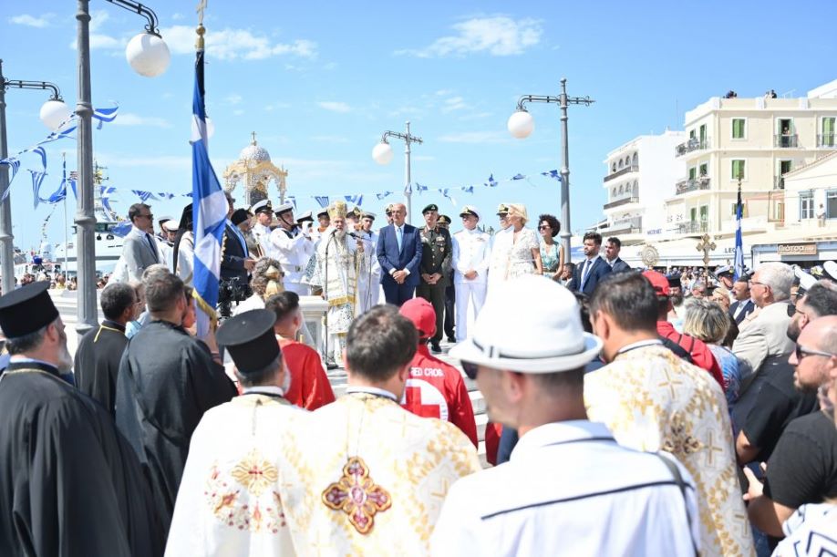 Ο Υπουργός Εθνικής Άμυνας Νίκος Δένδιας εκπροσώπησε τον Πρόεδρο της Κυβέρνησης σήμερα, Πέμπτη 15 Αυγούστου 2024, στον εορτασμό της Κοίμησης της Θεοτόκου και στην επιμνημόσυνη δέηση για την 84η επέτειο από τον τορπιλισμό του Καταδρομικού «ΕΛΛΗ», στην Τήνο.