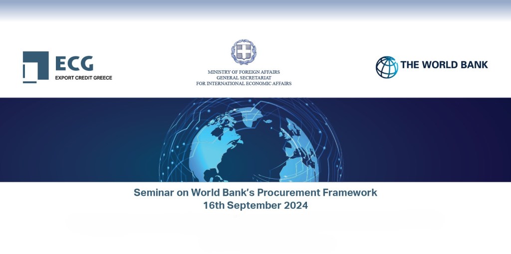 Σε συνέχεια προηγούμενων πρωτοβουλιών του Υπουργείου Εξωτερικών για την ενημέρωση των ελληνικών επιχειρήσεων σχετικά με τις δυνατότητες διεθνούς χρηματοδότησης, η Γενική Γραμματεία Διεθνών Οικονομικών Σχέσεων και Εξωστρέφειας, σε συνεργασία με την Παγκόσμια Τράπεζα και την Ελληνική Εταιρεία Εξαγωγικών Πιστώσεων, διοργανώνει Ημερίδα, με θέμα «Το Σύστημα Προμηθειών της Παγκόσμιας Τράπεζας» την Δευτέρα, 16 Σεπτεμβρίου 2024 στην Αθήνα.
