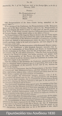 Το Πρωτόκολλο του Λονδίνου, ήταν μια σημαντική διεθνής συμφωνία, που υπεγράφη στις 3 Φεβρουαρίου 1830, μεταξύ των τριών Μεγάλων Δυνάμεων της εποχής, τη Μεγάλη Βρετανία, τη Γαλλία και τη Ρωσία. Η συμφωνία αφορούσε την ίδρυση και τη διεθνή αναγνώριση του νέου ανεξάρτητου ελληνικού κράτους. Επίσης, καθορίστηκαν τα σύνορα του νεοσύστατου ελληνικού κράτους, περιλαμβάνοντας στην επικράτειά του την Πελοπόννησο, τη Στερεά Ελλάδα και τις Κυκλάδες. Αρχικά οι Μεγάλες Δυνάμεις επιδίωξαν την αυτονομία της Ελλάδας υπό οθωμανική επικυριαρχία, αλλά το πρωτόκολλο του 1830 θεμελίωσε την πλήρη ανεξαρτησία της χώρας. Αποφασίστηκε επίσης, η εγκαθίδρυση μοναρχίας, με ξένο ηγεμόνα. Αρχική επιλογή ήταν ο Λεοπόλδος του Σαξ-Κόμπουργκ, ο οποίος αποσύρθηκε λόγω μη ικανοποίησης των αιτημάτων του από τις Μεγάλες Δυνάμεις. Μετά την άρνηση του Λεοπόλδου, ορίστηκε ο Όθωνας της Βαυαρίας, ως πρώτος βασιλιάς της Ελλάδας. Το πρωτόκολλο του Λονδίνου αποτέλεσε καθοριστική στιγμή στην ιστορία της Ελλάδας και του ελληνικού έθνους, καθώς σηματοδότησε την αναγνώριση της κυριαρχίας της από τη διεθνή κοινότητα.
