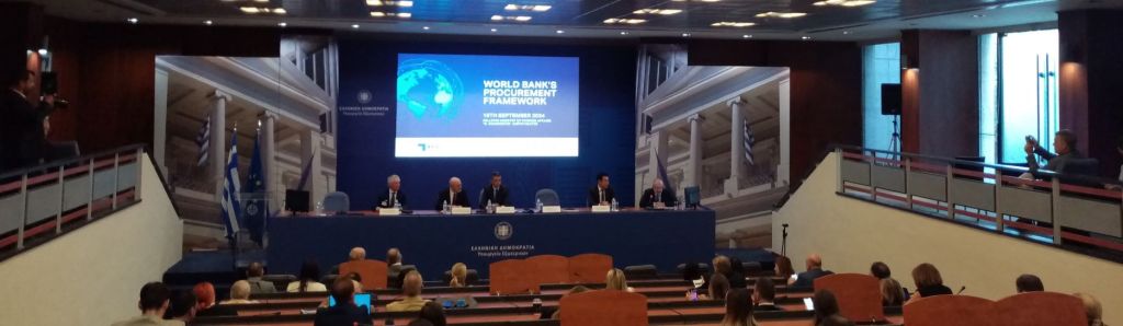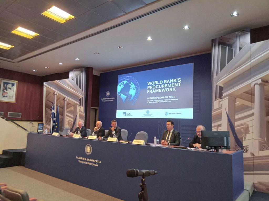 Με πρωτοβουλία της Γενικής Γραμματείας Διεθνών Οικονομικών Σχέσεων και Εξωστρέφειας διοργανώθηκε, σε συνεργασία με την Παγκόσμια Τράπεζα και την Export Credit Greece ενημερωτική ημερίδα χθες Δευτέρα 16 Σεπτεμβρίου 2024 στο Αμφιθέατρο «Γ. Κρανιδιώτης» του Υπουργείου Εξωτερικών, με θέμα «Το σύστημα προμηθειών της Παγκόσμιας Τράπεζας».