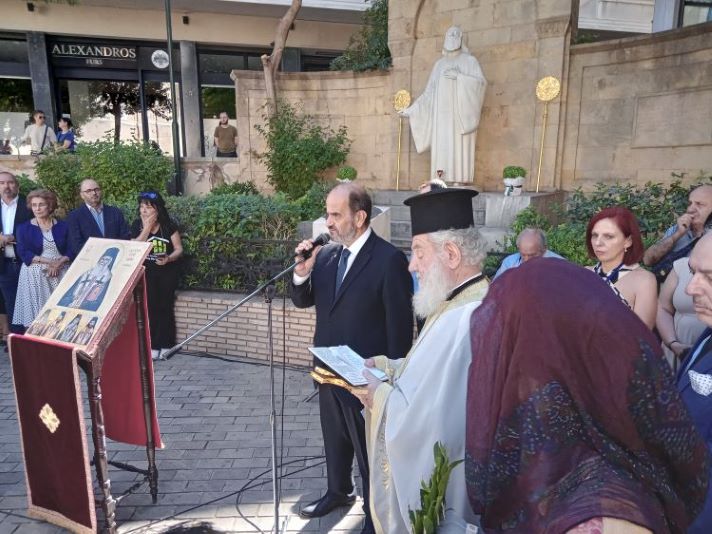 φωτ. Ο πρόεδρος της ΟΠΣΕ κ. Αντώνης Οραήλογλου κατά την ομιλία του και την κατάθεση στεφάνου στο Μνημείο του Αγίου Χρυσοστόμου Σμύρνης