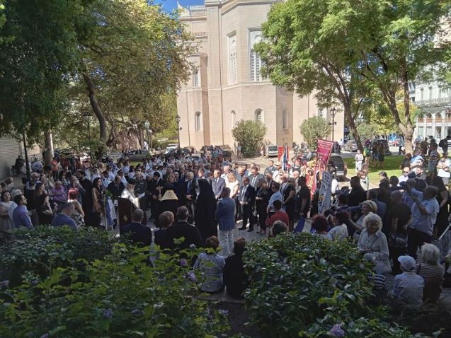 φωτ. από την Μητρόπολη Αθηνών, μπροστά η αιματοβαμμένη ελληνική σημαία