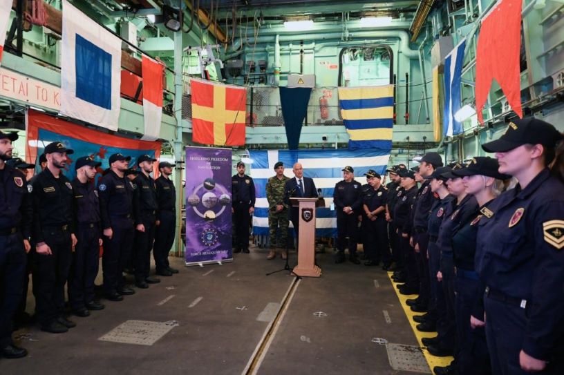 Ο κ. Δένδιας μετά την ολοκλήρωση της ενημέρωσης απηύθυνε ομιλία προς τον Κυβερνήτη, τα στελέχη και το πλήρωμα της Φρεγάτας, επισημαίνοντας τα ακόλουθα: