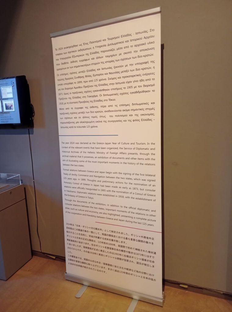 Στην πολύ ενδιαφέρουσα έκθεση παρουσιάστηκαν σημαντικά έγγραφα στην ελληνική, ιαπωνική και αγγλική γλώσσα, από την έναρξη των σχέσεων μεταξύ Ελλάδος και Ιαπωνίας, από τις Διπλωματικές και Προξενικές Σχέσεις μετά το 1920, Ελληνο-ϊαπωνικής Φιλίας και Εθιμοτυπίας καθώς και των Οικονομικών και Εμπορικών Σχέσεων μεταξύ των δύο χωρών.