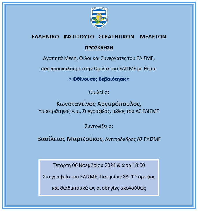 «Φθίνουσες Βεβαιότητες» θα είναι το θέμα ομιλίας που θα πραγματοποιηθεί στο Ελληνικό Ινστιτούτο Στρατηγικών Μελετών (ΕΛΙΣΜΕ) αύριο Τετάρτη 6 Νοεμβρίου 2024 (ώρα 6μμ) από τον Κωνσταντίνο Αργυρόπουλο Υποστράτηγο ε.α., Συγγραφέα, μέλος του ΕΛΙΣΜΕ και Συντονιστή τον Αντιπρόεδρο του ΕΛΙΣΜΕ Βασίλειο Μαρτζούκο.