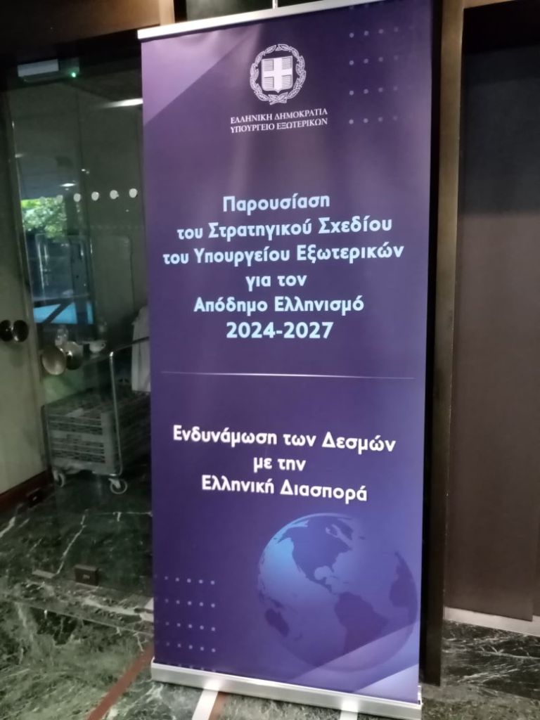 Παρουσιάστηκε σήμερα Τετάρτη 6 Νοεμβρίου 2024 στην αίθουσα «Γιάννος Κρανιδιώτης» του Υπουργείου Εξωτερικών το Στρατηγικό Σχέδιο για τον Απόδημο Ελληνισμό 2024-2027 με σύνθημα «Ενδυνάμωση των δεσμών με την Ελληνική Διασπορά», παρουσία του Πρωθυπουργού Κυριάκου Μητσοτάκη.