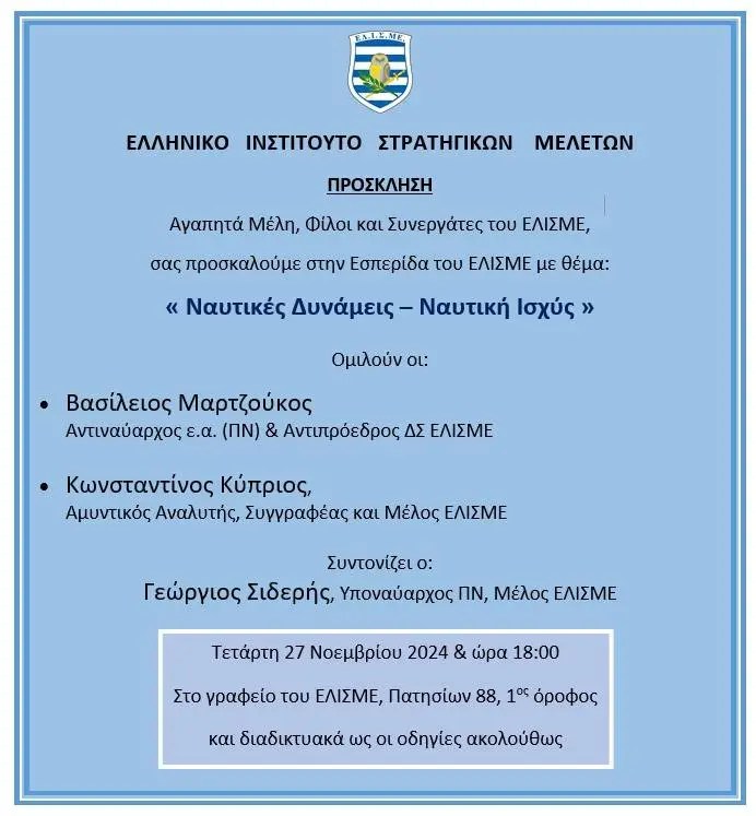 Το Ελληνικό Ινστιτούτο Στρατηγικών Μελετών (ΕΛΙΣΜΕ) διοργανώνει εσπερίδα με θέμα «Ναυτικές Δυνάμεις – Ναυτική Ισχύς» την Τετάρτη 27 Νοεμβρίου 2024 ώρα 6 μ.μ.