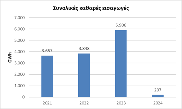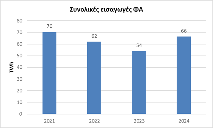 - Το 2024 Οι συνολικές εισαγωγές φυσικού αερίου της Ελλάδας ανήλθαν σε 66.4 TWh το 2024, αυξημένες κατά 23% σε ετήσια βάση. Η συνεισφορά του LNG κατά 30% το 2024 αναδεικνύει τον σημαντικό ρόλο που ήδη παίζει και αναμένεται να διαδραματίσει το εν λόγω καύσιμο τα επόμενα χρόνια στο πλαίσιο απεξάρτησης από το ρωσικό φυσικό αέριο.