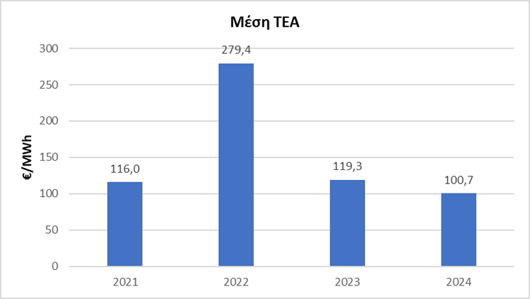 - Μείωση των τιμών της ηλεκτρικής ενέργειας και του φυσικού αερίου το 2024 στην Ελλάδα. Ειδικότερα, η μέση Τιμή Εκκαθάρισης της Αγοράς (ΤΕΑ) το 2024 εμφανίστηκε μειωμένη κατά 16% σε σύγκριση με το 2023 και διαμορφώθηκε στα €100.74/MWh. Σε τροχιά αποκλιμάκωσης βρίσκονται και οι τιμές στο Βάθρο Εμπορίας Φυσικού Αερίου του Ελληνικού Χρηματιστήριου Ενέργειας, με την μέση τιμή για το 2024 να διαμορφώνεται στα €32.8/MWh από €40.7/MWh το 2023.
