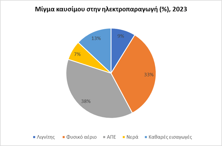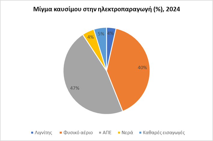 - Το μίγμα καυσίμου στην ηλεκτροπαραγωγή το 2024 χαρακτηρίστηκε από ισχυρή συμμετοχή των ΑΠΕ και του φυσικού αερίου, συνεισφέροντας κατά 47% και 40% αντίστοιχα.
