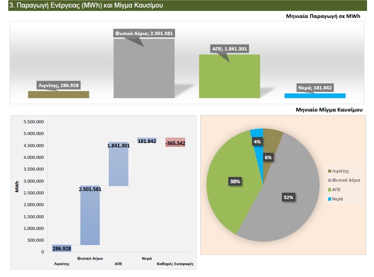 - Αξίζει να σημειωθεί ότι το μερίδιο του φυσικού αερίου στο μίγμα καυσίμου της Ελλάδας αυξήθηκε κατά 16% σε σύγκριση με τον Ιανουάριο του 2024, ενώ η συνεισφορά των ΑΠΕ μειώθηκε κατά 10%. Ειδικότερα, το μερίδιο του φυσικού αερίου τον Ιανουάριο του 2025 ήταν στο 52%, από το 36% τον Ιανουάριο του 2024, ενώ αντίστοιχα το μερίδιο των ΑΠΕ διαμορφώθηκε στο 38% τον περασμένο Ιανουάριο από το 48% τον Ιανουάριο του 2024.