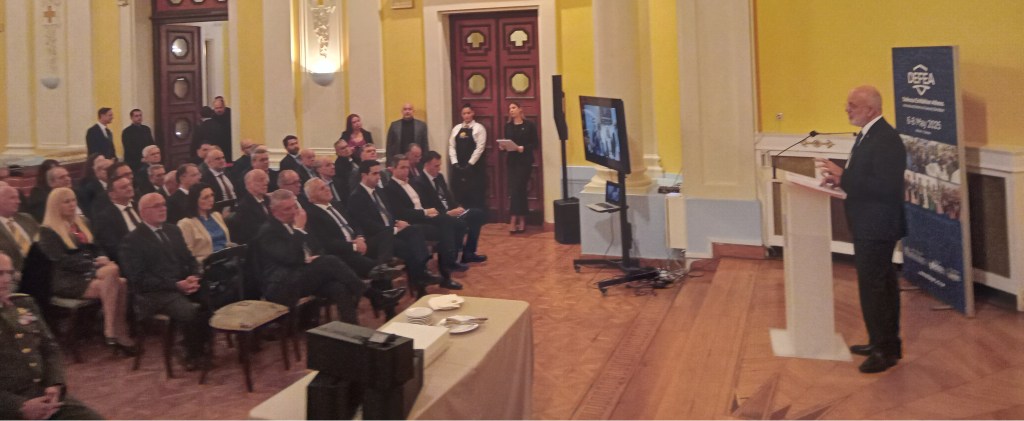 Αμέσως μετά, ο Διευθυντής της Defence Exhibition Athens – DEFEA Βασίλειος Μπάρκας ανέβηκε στο βήμα των ομιλητών. Με λόγο σύντομο και περιεκτικό, ο δυναμικός παράγοντας της πολυαναμενόμενης διεθνούς εμβέλειας αμυντικής έκθεσης που θα λάβει χώρα στο Metropolitan Expo πλησίον του Αεροδρομίου Αθηνών αναφέρθηκε στις προοπτικές που ανοίγονται στην αμυντική βιομηχανία χάρις την έκθεση DEFEA. Αρκεί να σημειωθεί ότι θα συμμετέχουν σε αυτήν εκατοντάδες εκθέτες από πολλές ξένες χώρες, θα παρευρεθούν χιλιάδες ξένοι και Έλληνες επισκέπτες, μεταξύ άλλων, Υπουργοί Άμυνας, Αρχηγοί Ενόπλων Δυνάμεων, Διεθνείς Αμυντικοί Σύνδεσμοι, Ακόλουθοι Άμυνας ξένων χωρών και πολλοί άλλοι παράγοντες της διεθνούς άμυνας δημιουργώντας πρόσφορο έδαφος ευκαιριών για συνεργασίες και επενδύσεις.