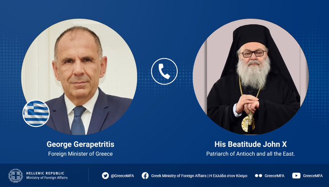 Ο Υπουργός Εξωτερικών Γιώργος Γεραπετρίτης είχε τηλεφωνική συνομιλία με τον Μακαριώτατο Πατριάρχη Αντιοχείας και πάσης Ανατολής Ιωάννη με επίκεντρο τις τελευταίες εξελίξεις στη Συρία, όπως αναφέρει ανάρτηση του Υπουργείου στο Χ.
