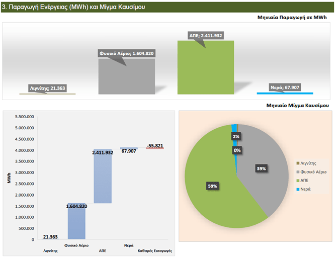 - Το μίγμα καυσίμου στην ηλεκτροπαραγωγή τον περασμένο Μάρτιο χαρακτηρίστηκε από ισχυρή συμμετοχή των ΑΠΕ, ακολουθούμενες από το φυσικό αέριο, συνεισφέροντας στα επίπεδα του 59% και 39% αντίστοιχα.
