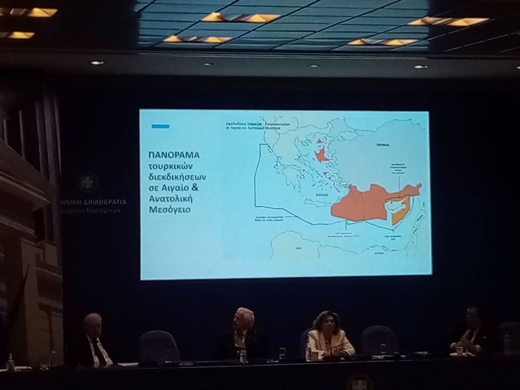 Στην εκδήλωση, η οποία απευθυνόταν σε κοινό σχετικό με το Υπουργείο Εξωτερικών, τη Διπλωματική Ακαδημία, αλλά και δεξαμενές σκέψης όπως το ΙΕΝΕ, η ΕΛΙΣΜΕ, το ΙΔΙΣ και το ΕΛΙΑΜΕΠ, ανεγνώσθη χαιρετισμός του Υπουργού Εξωτερικών, κ. Γιώργου Γεραπετρίτη.