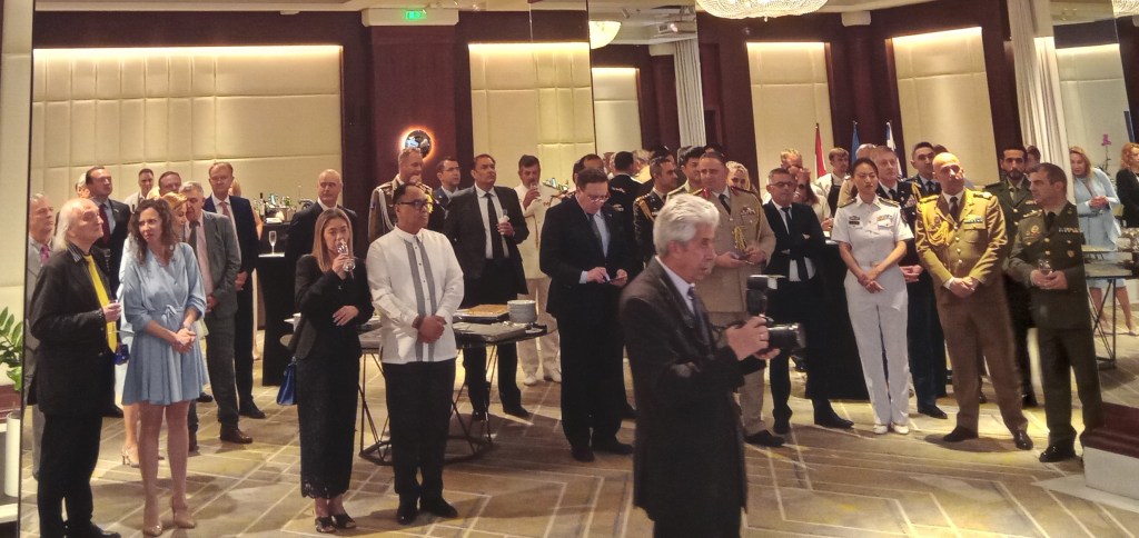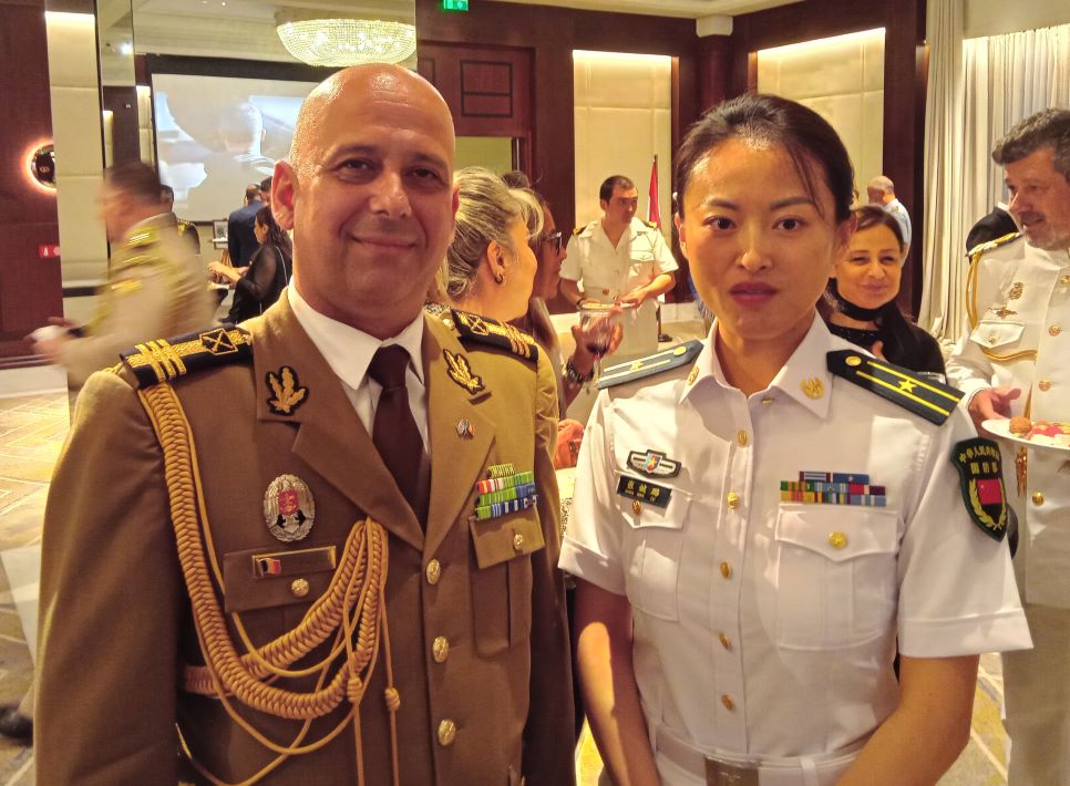 φωτ.από αριστερά ο ΑΚΑΜ Ρουμανίας Συνταγματάρχης κ. Vasile Stănescu, μαζί του η Πλωτάρχης κα Zhang Wanlu, εκ της Γραμματείας του Ακολούθου Άμυνας της Κίνας και στο βάθος δεξιά διακρίνεται ο Ακόλουθος Άμυνας της Ισπανίας Πλοίαρχος κ. Federico Antonio Garcia Castro