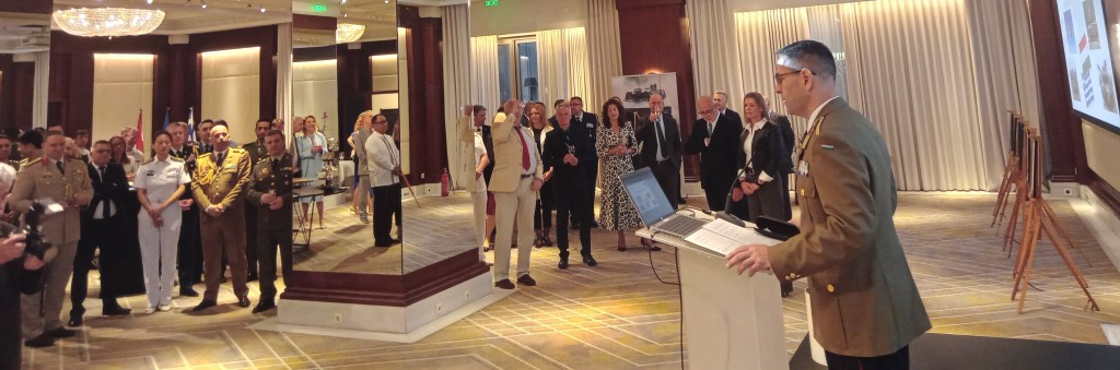 Εκεί, αφού χαιρετίσαμε φίλους και γνωστούς Διπλωμάτες, Στρατιωτικούς και Επιχειρηματίες, περιηγηθήκαμε στην ενδιαφέρουσα έκθεση με σχέδια της κυρίας Kata Sandor, Στρατιωτικού ε.α. και νυν Εφέδρου, συζύγου του Ούγγρου Πρέσβεως. Την έμπνευση για την δημιουργία των έργων της, η κα Sandor την είχε κατά την παραμονή της σε αποστολή στο Ιράκ το έτος 2022. Κύριο στοιχείο στις καλλιτεχνικές δημιουργίες ήταν οι πολεμικές εικόνες από μαχητές, τανκς και ελικόπτερα. Η έκθεση είναι μια ακόμα απόδειξη ότι οι στρατιωτικοί διαθέτουν και καλλιτεχνικό ταλέντο μαζί με τη μαχητικότητα.