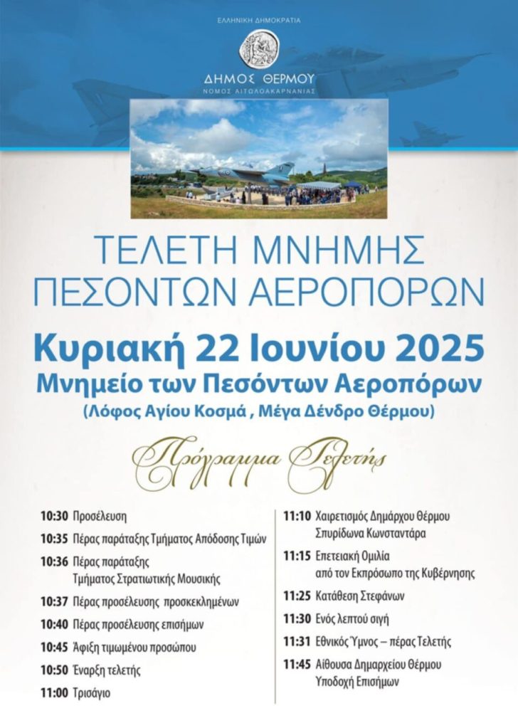 Η μνήμη των Πεσόντων Αεροπόρων Νικολάου Ανδρέα Σιαλμά (εδώ), Κωνσταντίνου Αθανασίου Κοντογιώργου, Βασίλειου Γεωργίου Κουρκούτα, Ευστάθιου Χαριλάου Τσίγκα και Ευάγγελου Γεωργίου Σταθόπουλου θα τιμηθεί με εκδήλωση που θα πραγματοποιηθεί την Κυριακή 22 Ιουνίου 2025 στον λόφο του Αγίου Κοσμά, στο Μέγα Δένδρο Θέρμου Αιτωλοακαρνανίας όπου βρίσκεται και το Μνημείο των Πεσόντων Αεροπόρων.
