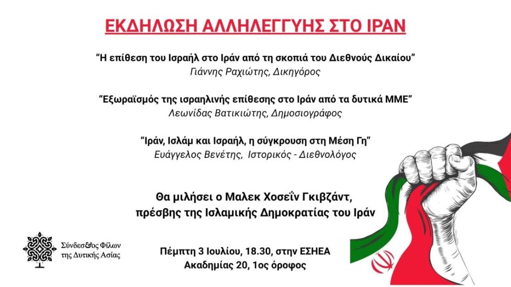 Ενημερωτική εκδήλωση για το Ιράν θα πραγματοποιηθεί σήμερα Πέμπτη 3 Ιουλίου στις 18.30 στην ΕΣΗΕΑ (Αίθουσα “Γεώργιος Καράντζας” 1ος Όροφος), όπως αναφέρει σχετική ανακοίνωση.
