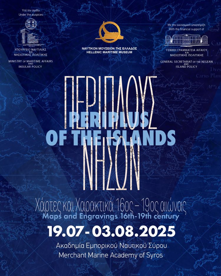 Το Ναυτικό Μουσείο της Ελλάδος παρουσιάζει στην Ακαδημία Εμπορικού Ναυτικού Σύρου την έκθεση «Περίπλους Νήσων – Χάρτες και Χαρακτικά 16ος-19ος αι.», η οποία τελεί υπό την αιγίδα του Υπουργείου Ναυτιλίας και Νησιωτικής Πολιτικής