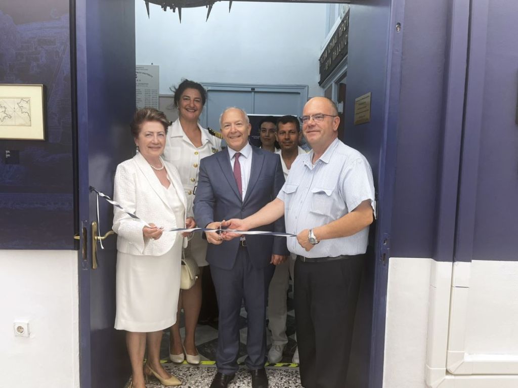 η Διοικήτρια Ν.Α.Τ. κα Γεωργία Μανιάτη, ο Διευθυντής της ONEX NEORION SHIPYARDS κ. Ιωάννης Βαμβακούσης, ο Πρόεδρος του Μουσείου Ναυτικής Παράδοσης Σύρου κ. Γεώργιος Μηλιός,