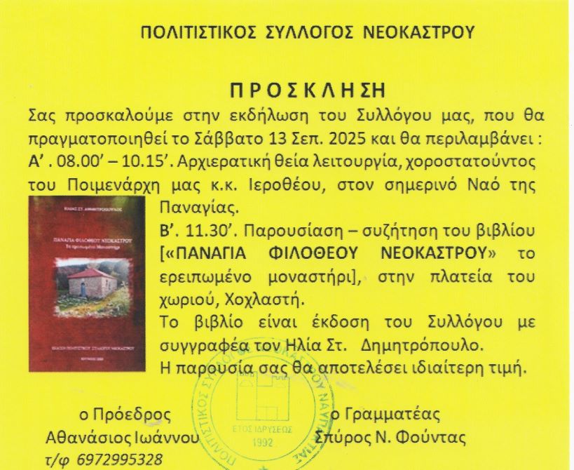 Ο Πολιτιστικός Σύλλογος Νεοκάστρου με την ευκαιρία της παρουσίασης του βιβλίου τού Σμήναρχου ε.α. Ηλία Στ. Δημητρόπουλου με τον τίτλο «ΠΑΝΑΓΙΑ ΦΙΛΟΘΕΟΥ ΝΕΟΚΑΣΤΡΟΥ – το ερειπωμένο Μοναστήρι», διοργανώνει το Σάββατο 13 Σεπτεμβρίου 2025 εορταστική εκδήλωση, που περιλαμβάνει δύο ενότητες :